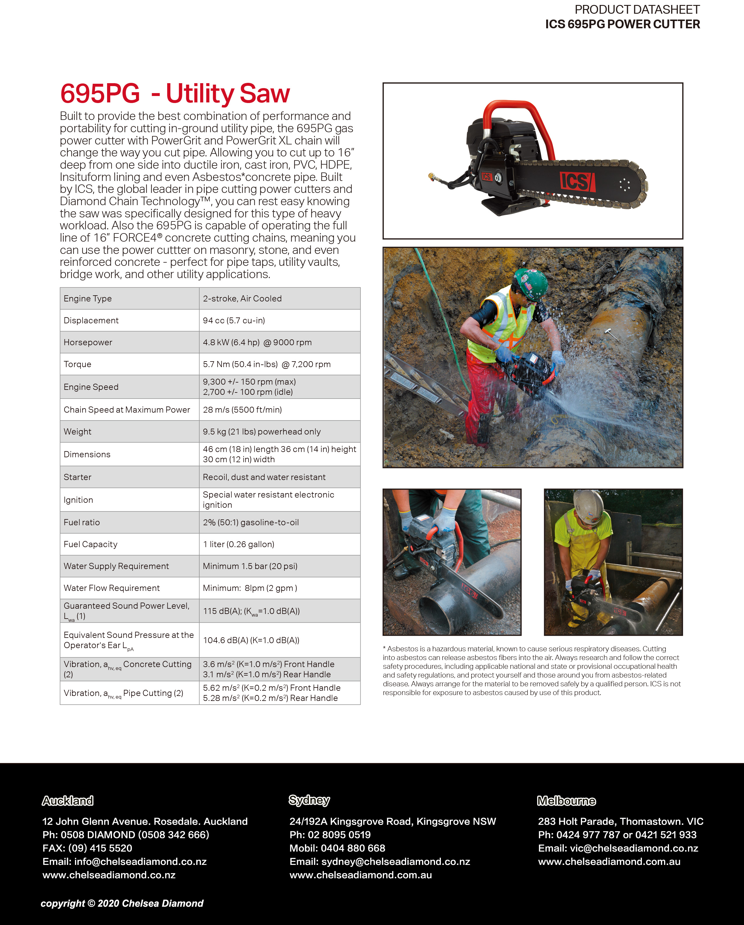 ICS® 695XL-16 PG Petrol Chainsaw 94cc, 6.4HP with 16” Force4® bar & PowerGrit® diamond chain for ductile iron, plastic pipe etc