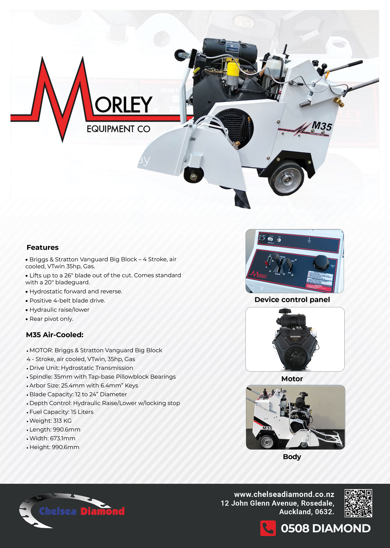 The compact M35 features a gas powered 35 horsepower Briggs & Stratton Vanguard Big Block – 4 Stroke, air cooled, VTwin. The compact all-purpose Concrete Saw is 1m tall, 0.68m wide, 1m long and weighs 310kg.