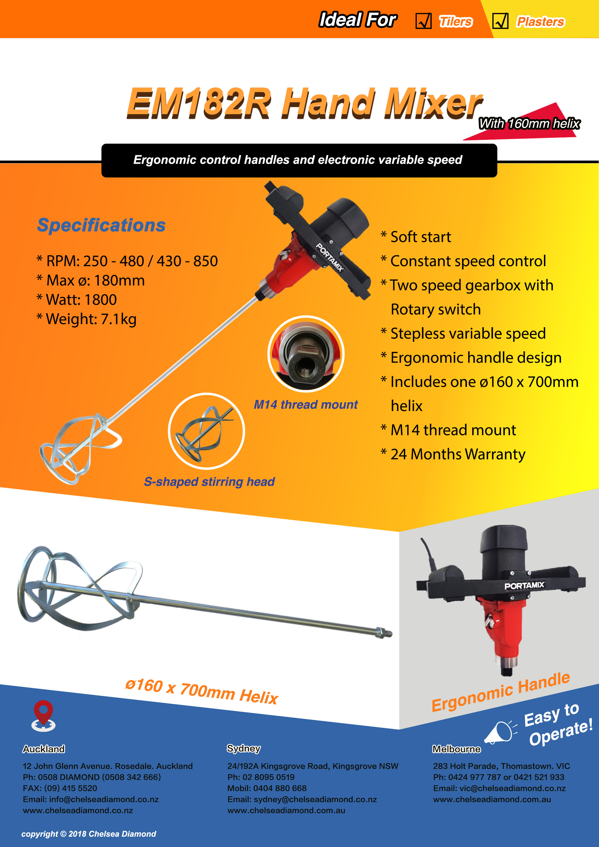 PortaMix™ EM182R Mixer 1800W, two speed (250-480/430-850 rpm) with ø160 paddle 7.1Kg
